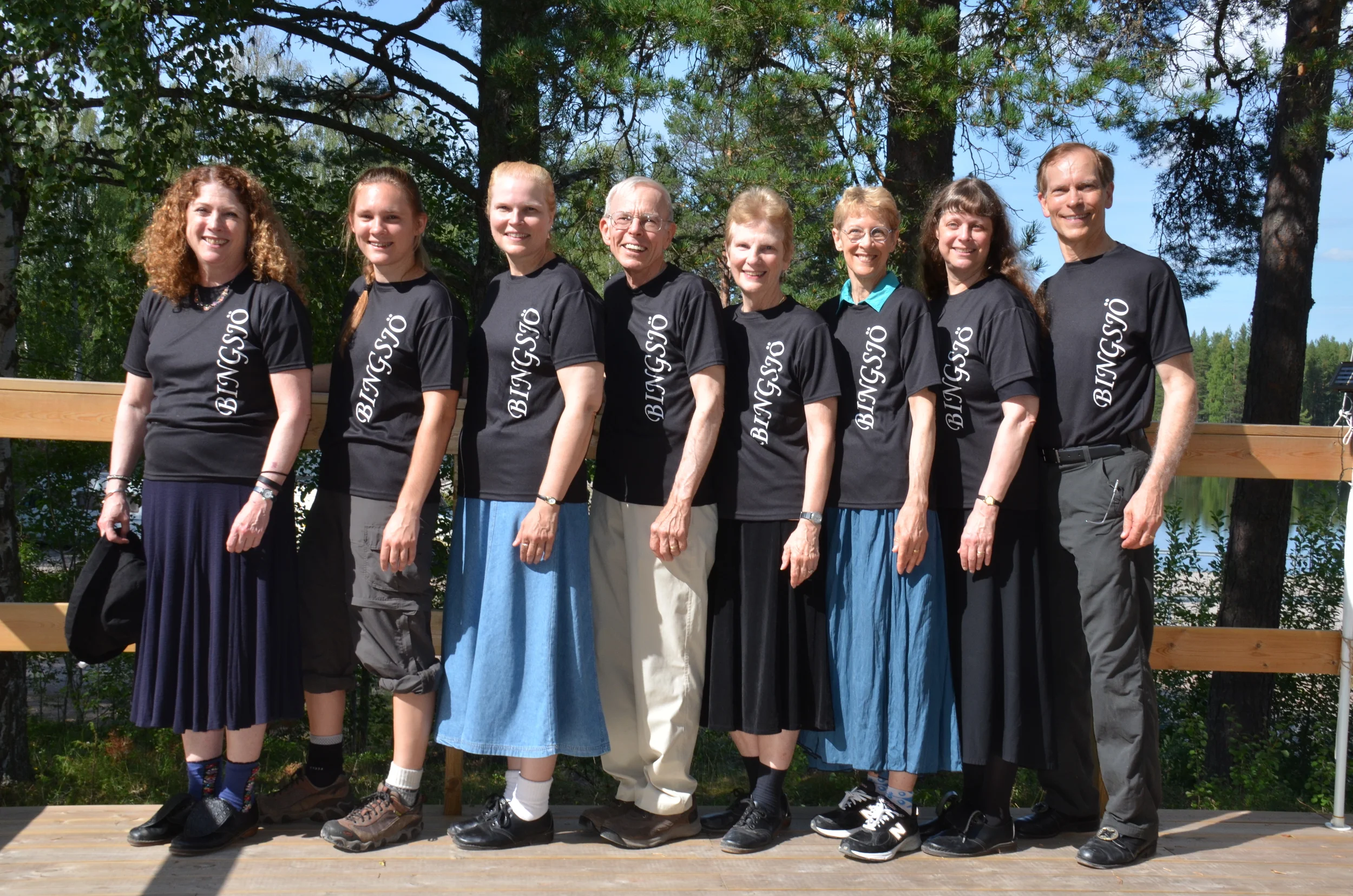 The eight members of Scandia DC who traveled to Sweden in late July 2014 to train for the Uppdansning at the Virtanen's camp in Furudals Bruk (Dalarna) are shown here in their new T-shirts purchased at the only store in the tiny Dalarna town of Bingsjö.